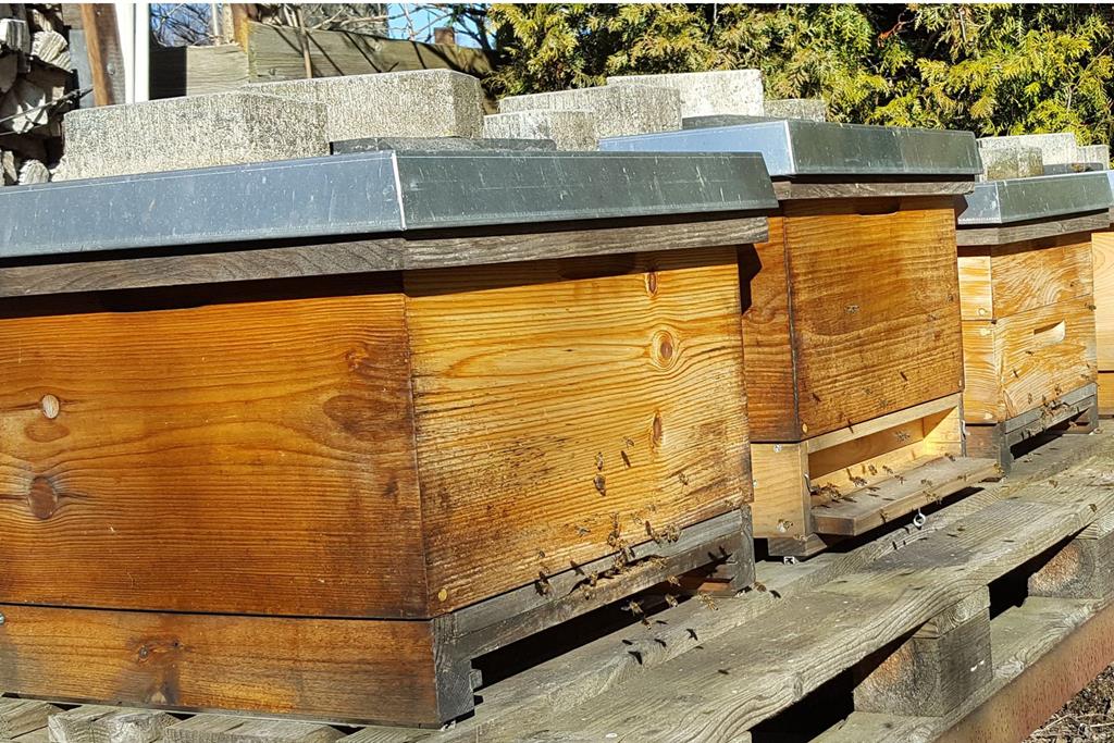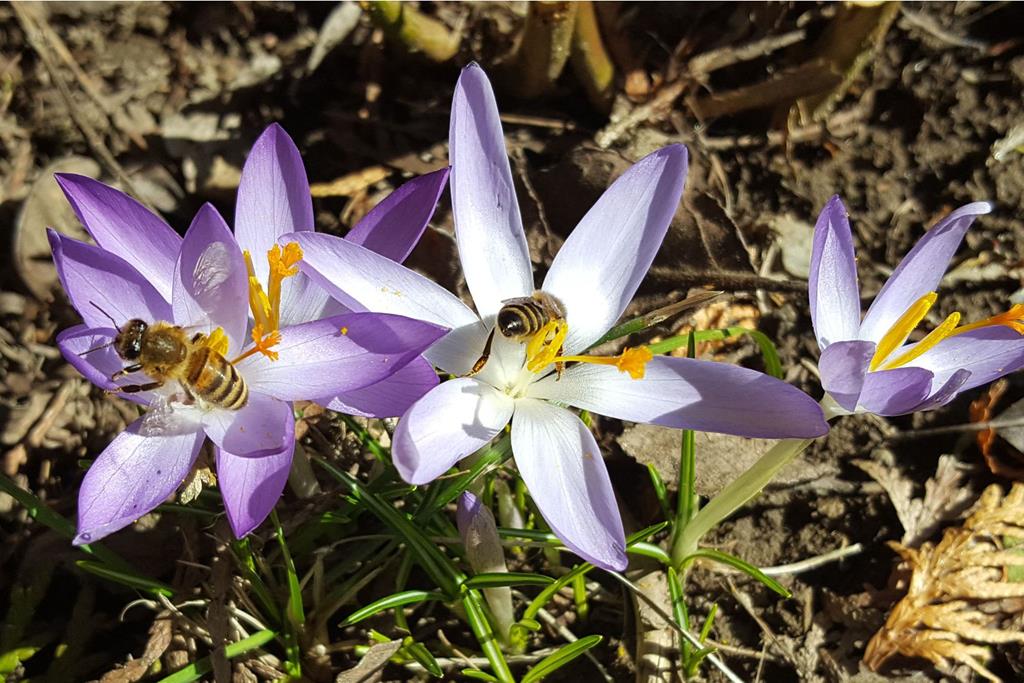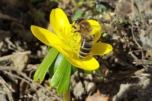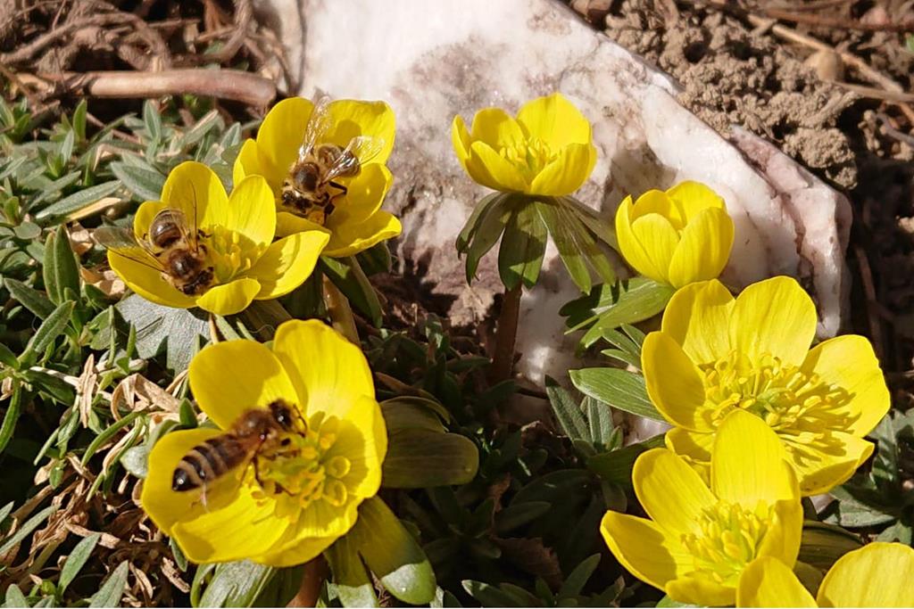 Bei ungewöhnlich frühlingshaften Temperaturen und strahlendem Sonnenschein bereits Mitte Februar fliegen unsere Bienen und tragen schon fleißig Pollen ein.